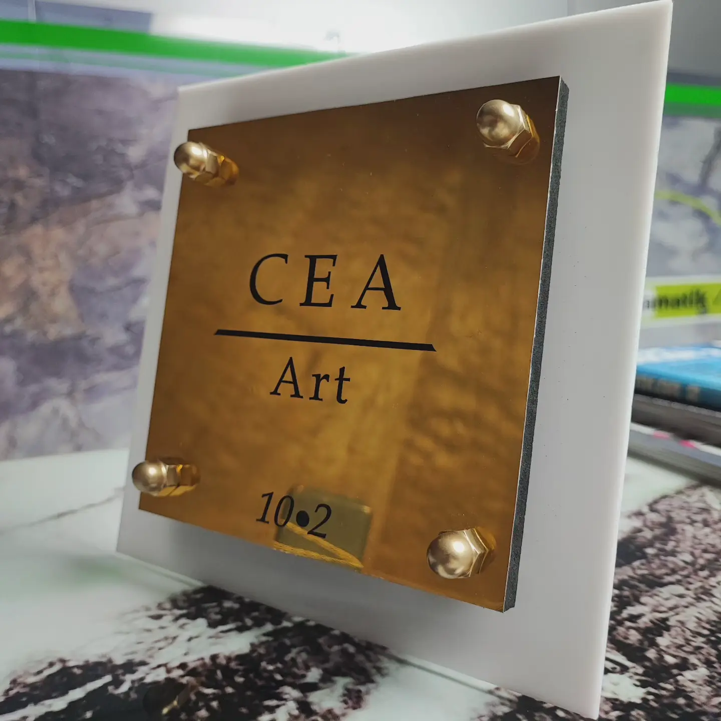 - Premiummetallutseende: Tillverkad av högkvalitativt material, erbjuder den en äkta metallestetik med sin guldfärgade matta textur och ger omedelbart prestige till ditt kontor.