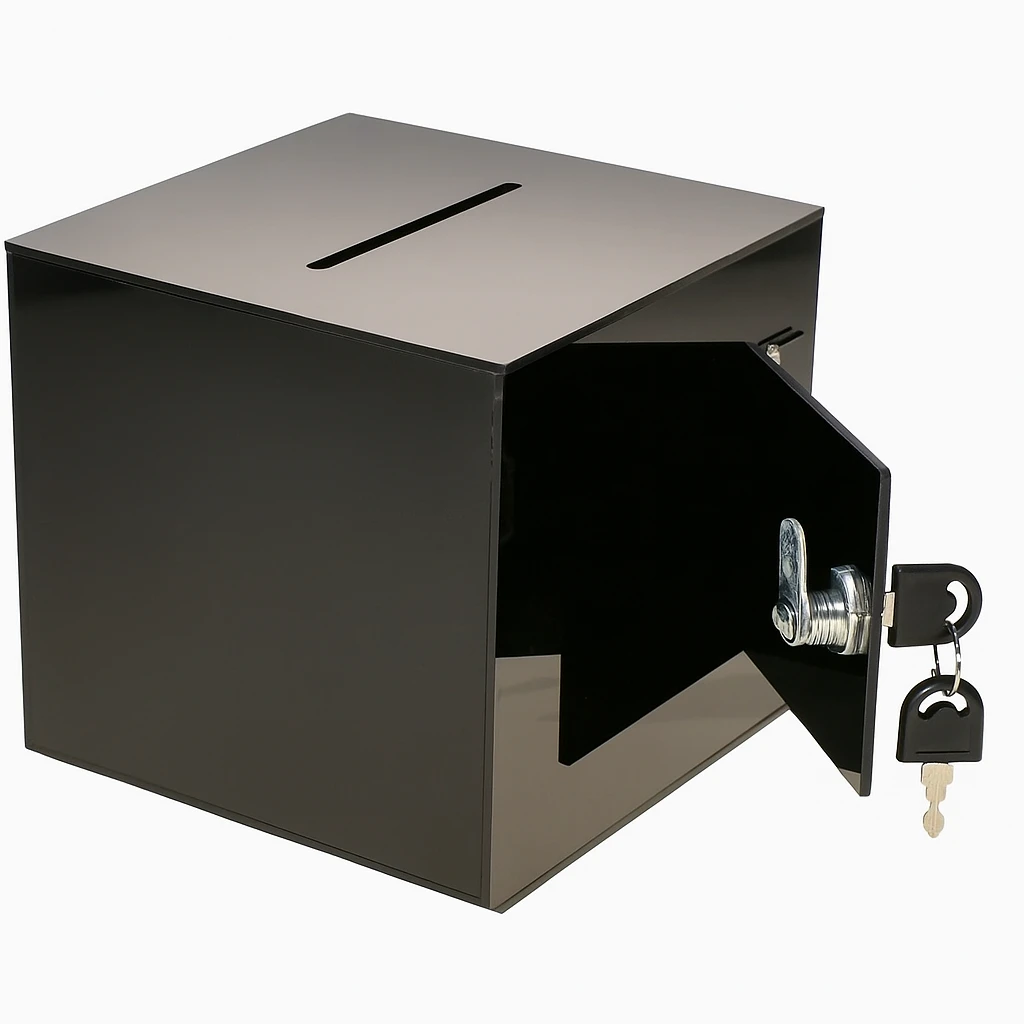 The Colorful Door Acrylic Donation Box, with its glass-like glossy surface and durable construction, is suitable for use as a donation, suggestion, vote, and complaint box. Its lid and lockable feature ensure secure use.